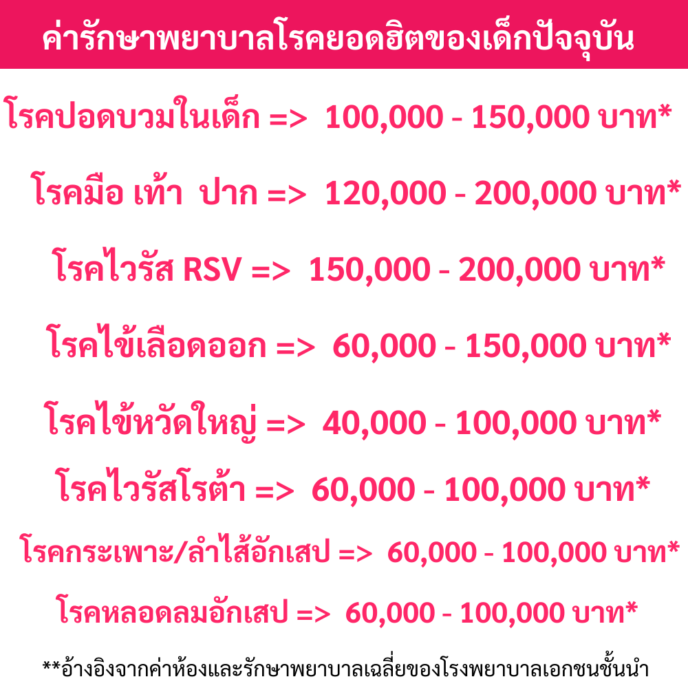 หลายคนอาจมองว่าค่าใช้จ่ายดังกล่าวเป็นเรื่องเล็กน้อย เราสามารถดูแลได้ แต่ทว่าปัญหาด้านสุขภาพมีโอกาสเกิดเสมอซึ่งเมื่อไม่สบายแล้วเด็กบางคนอาจใช้เงินจำนวนมากกว่าผู้ใหญ่หลายต่อหลายเท่าตั้งแต่หลักพันไปจนถึงหลักแสนหรือหลักล้านบาท การบริหารความเสี่ยงเช่นการซื้อประกันให้ลูกจึงเป็นเรื่องที่หลีกเลี่ยงไม่ได้