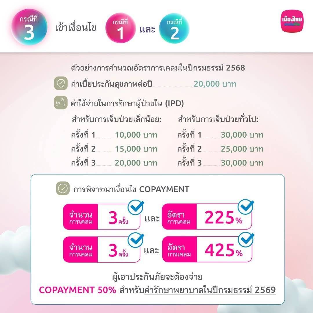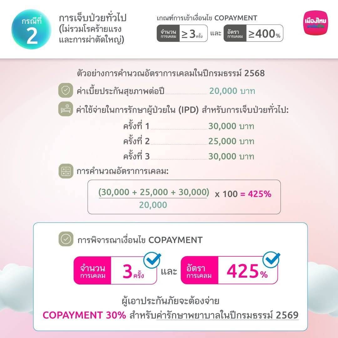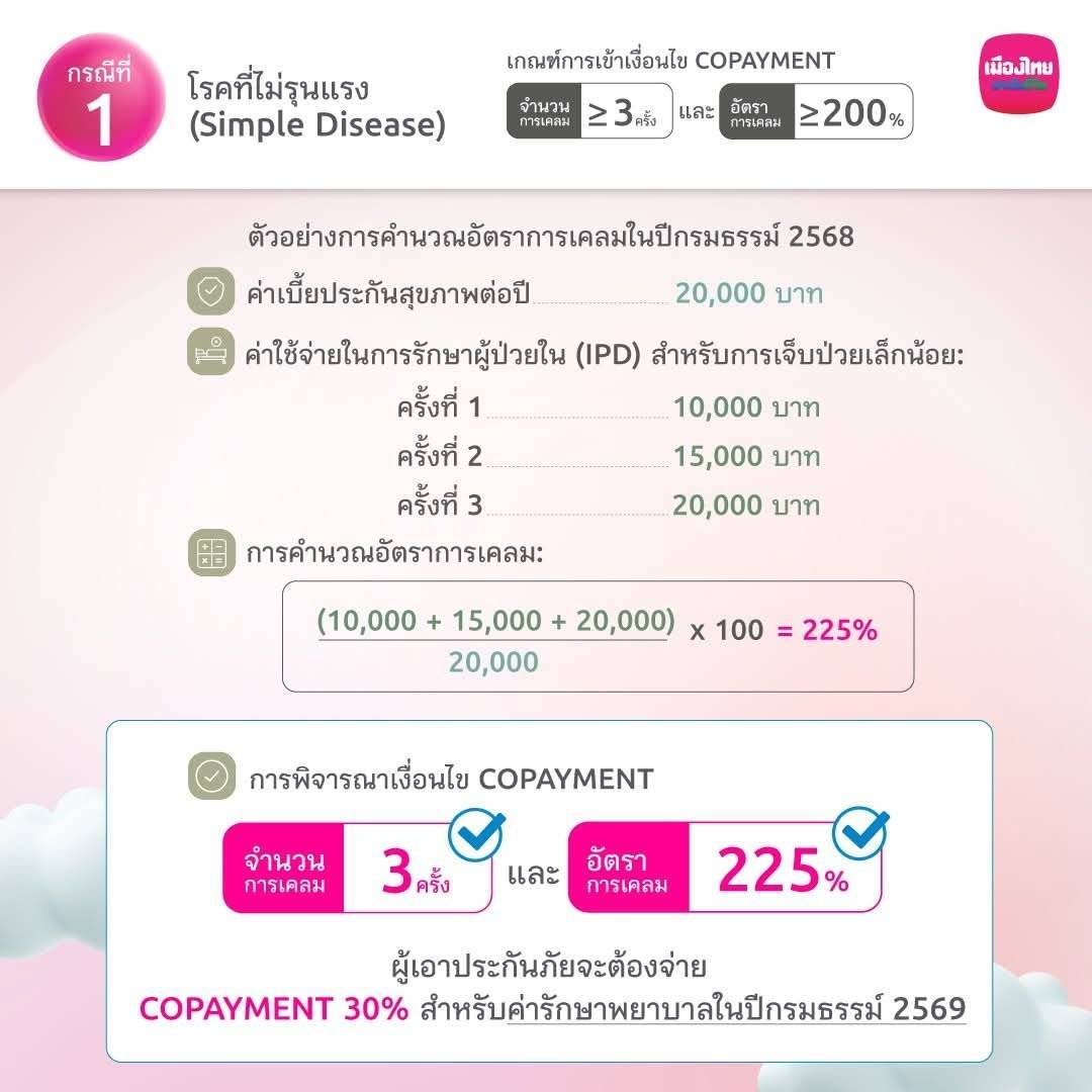 เข้ารักษาตัวในโรงพยาบาลด้วยโรค Simple Diseases มากกว่าหรือเท่ากับ 3 ครั้งขึ้นไป และค่าใช้จ่ายในการรักษาตัว เกิน 400% ของเบี้ยประกันสุขภาพ โดยต้องเข้าทั้ง 2 เงื่อนไข คือ จำนวนครั้งและ%ค่ารักษาพยาบาล หากเข้าเงื่อนไขทั้ง 2 ข้อ ปีถัดไปต้องร่วมจ่ายค่ารักษาทุกโรค IPD Copayment ร่วมจ่าย 30%