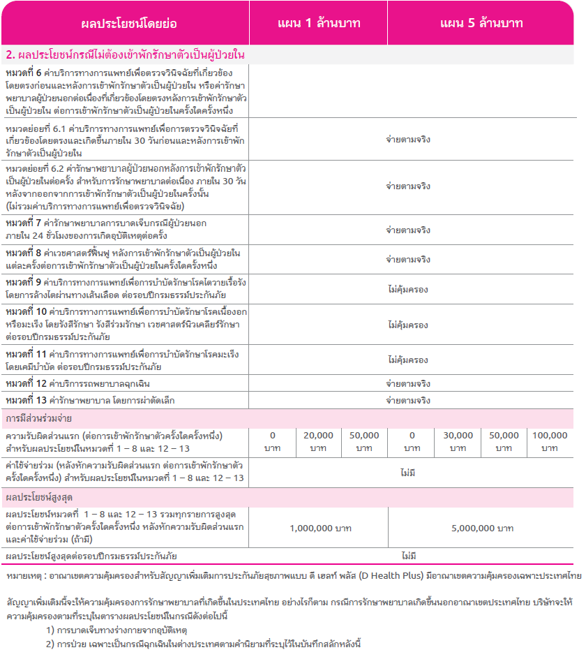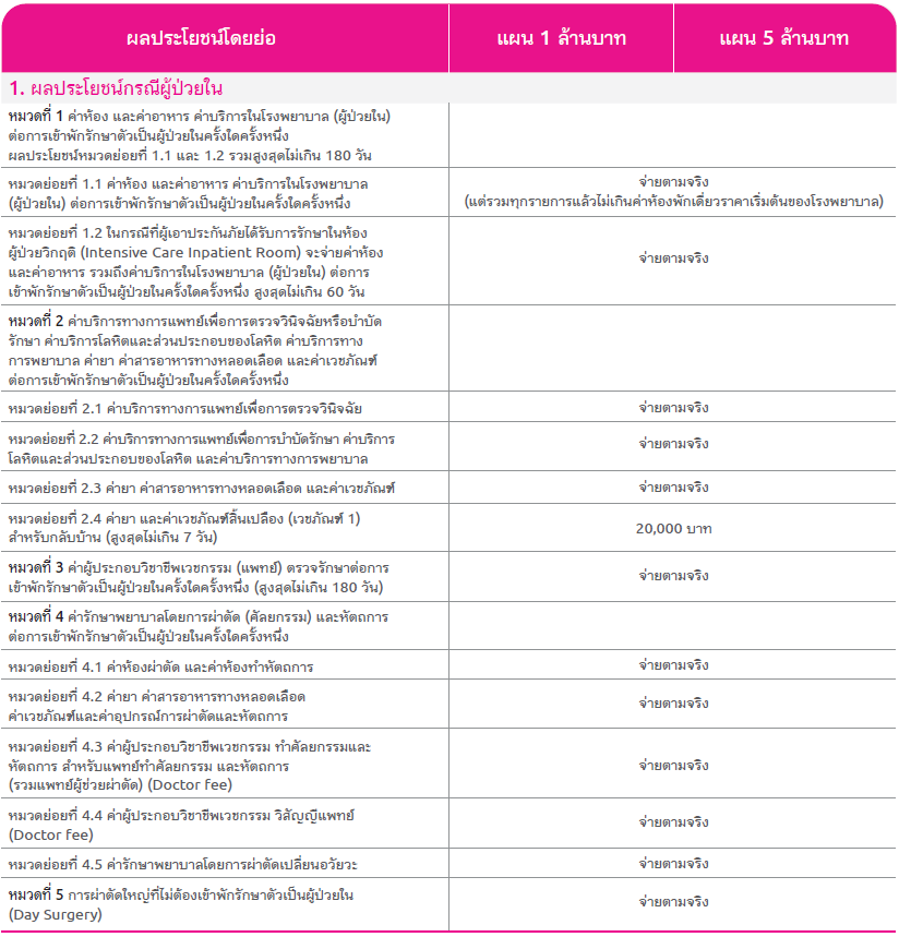 ประกันสุขภาพเหมาจ่ายดีเฮลท์พลัส เหมาจ่ายปีละ 5 ล้านบาท - เจ็บป่วยไม่สบาย ผ่าตัด นอนห้องเดี่ยว รพ เอกชนได้ทุกที่ทั่วประเทศ เบิกค่ารักษาครั้งละ 5 ล้านบาท ไม่จำกัดวงเงินต่อปี