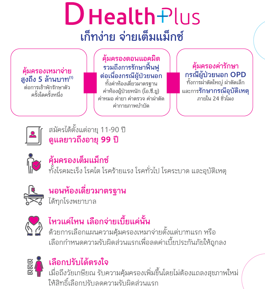 ประกันสุขภาพทั่วไปในปัจจุบันเป็นแบบเหมาจ่ายค่ารักษา แต่ไม่ได้เหมาจ่ายค่าห้อง วันนี้มีประกันสุขภาพเหมาจ่ายดีเฮลท์พลัส Dhealth Plus เข้าใจง่ายและเหมาจ่ายค่าห้องเดี่ยวมาตรฐาน Standard single room จ่ายตามจริงไม่ว่าโรงพยาบาลเอกชนหรือรัฐบาลไม่ต้องจ่ายส่วนต่างค่าห้องเพิ่ม และเหมาจ่ายค่ารักษาเมื่อนอนแอดมิดโรงพยาบาลครั้งละ 5 ล้านบาทไม่จำกัดจำนวนครั้งและ ไม่จำกัดวงเงินต่อปี