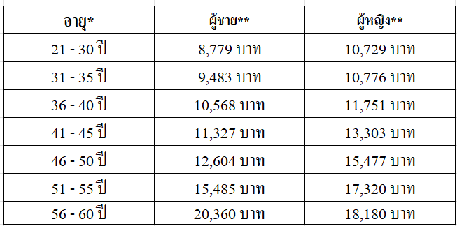* เบี้ยประกันปรับเพิ่มทุก 5 ปี / ** เบี้ยประกันโดยประมาณ กรุณา แจ้งเพศ และ ปี พศ เกิด เพื่อคำนวณเบี้ย