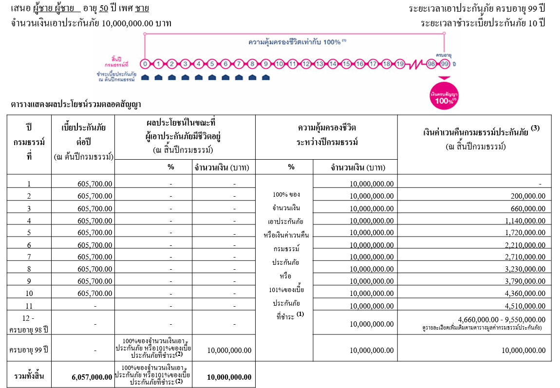 ผู้ชายอายุ 50 ปี ทุนประกัน 10 ล้านบาท เบี้ยประกันปีละ 605,700 บาท