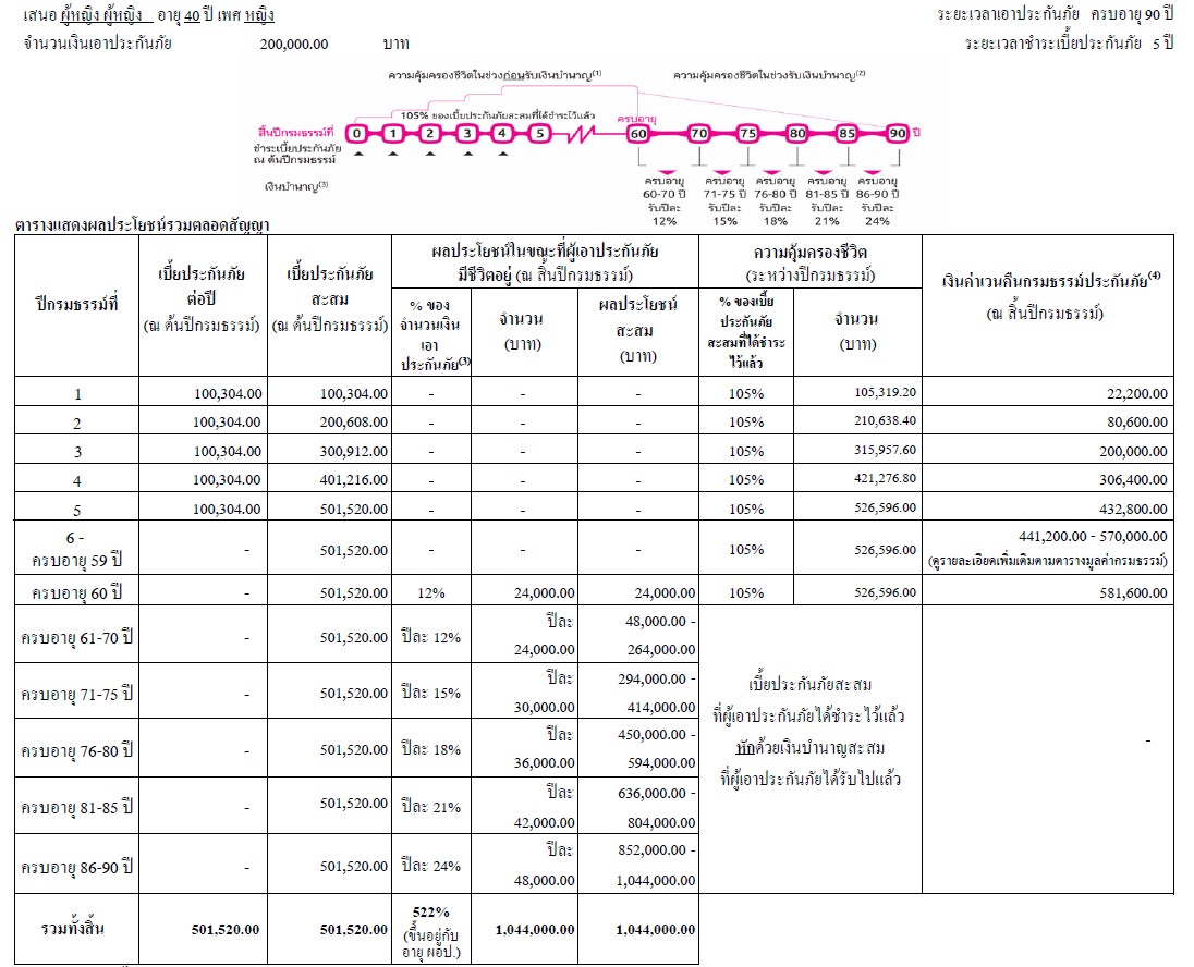 ผู้หญิง 40 ปี จำนวนเงินเอาประกัน 200,000 บาท เบี้ยปีละ 100,304 บาท