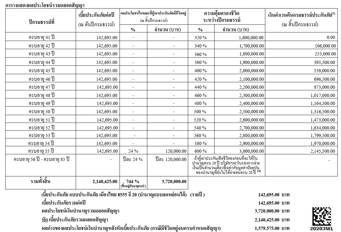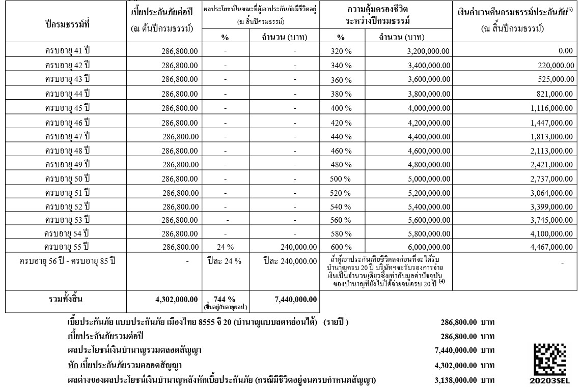 ชำระเบี้ย 15 ปี รวม 4,302,000 บาท ถ้ารับบำนาญถึงอายุ 85 ปี รับบำนาญรวม 7,440,000 บาท มากกว่าเบี้ยที่จ่าย 3,138,000 บาท