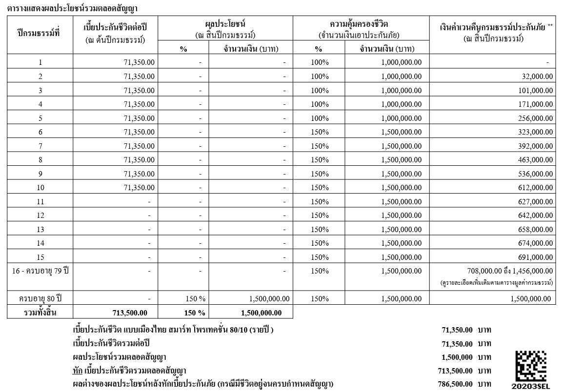 กรณีที่ 3 หากไม่เสียชีวิต อายุ 80 ปี ได้รับเงินคืน 1,500,000 บาท มากกว่าเบี้ยที่จ่าย 786,500 บาท
