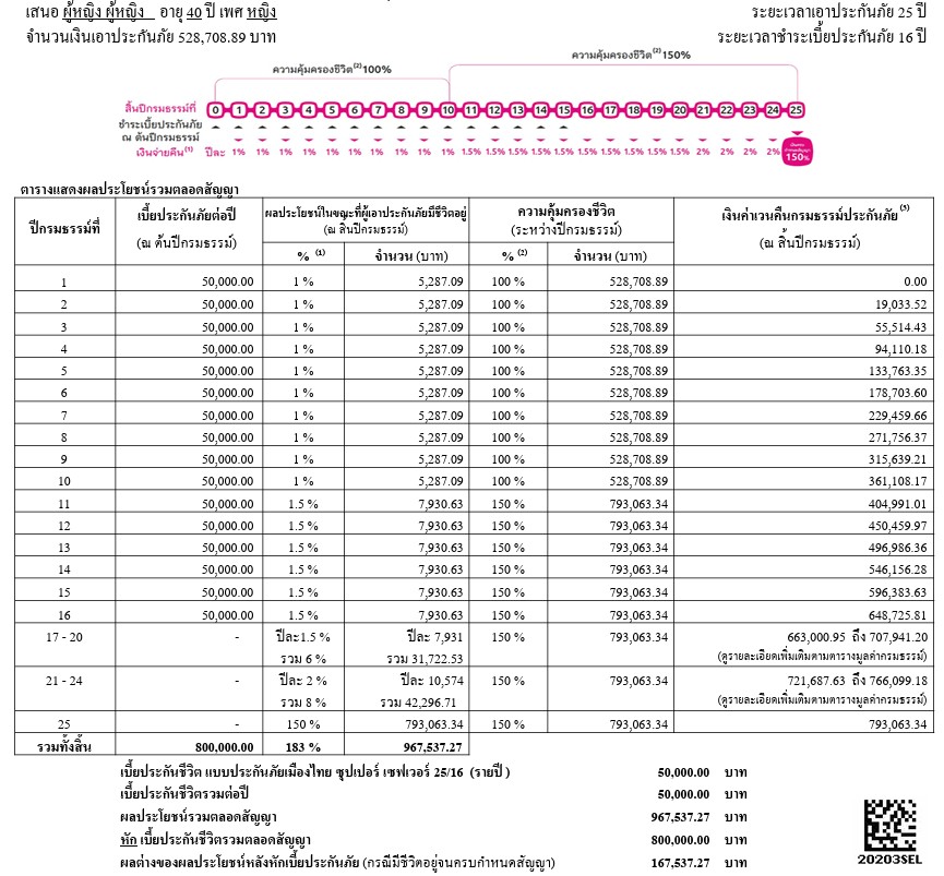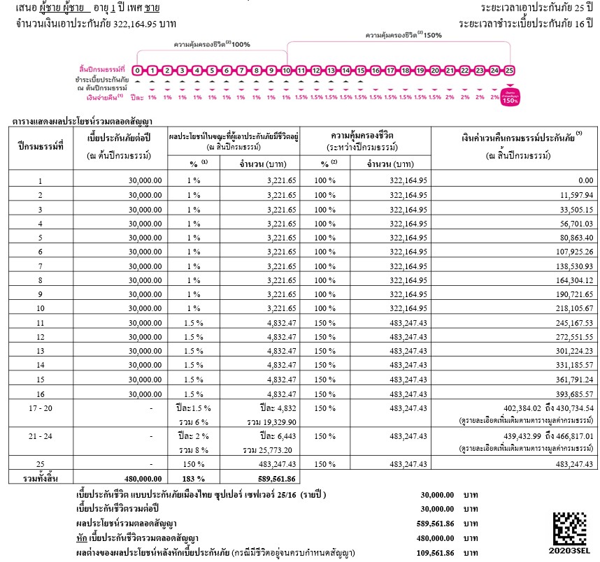 ตัวอย่างผลประโยชน์ประกันออมทรัพย์ซุปเปอร์เซฟเวอร์ 25/16